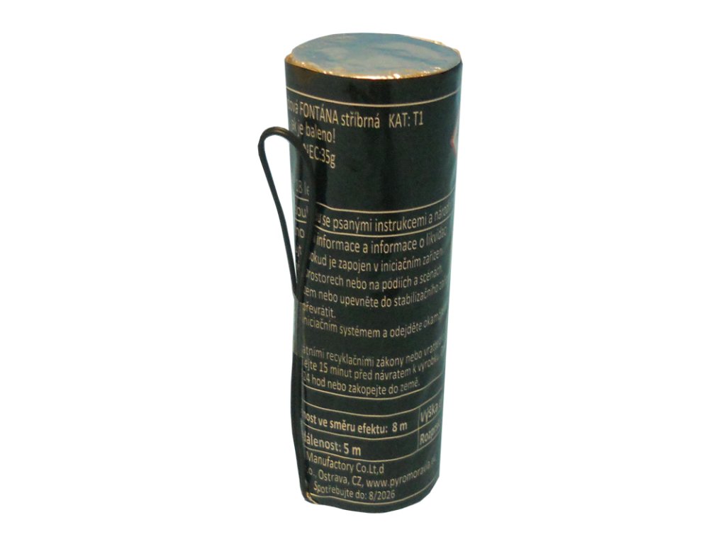 Fontána interiérová stříbrná. Výška efektu je 8 metrů, délka efektu je 1 sekunda. Efekt je s minimálním kouřem a zápachem. Fontána má zabudovaný elektrický palník. Iniciace přes baterku.