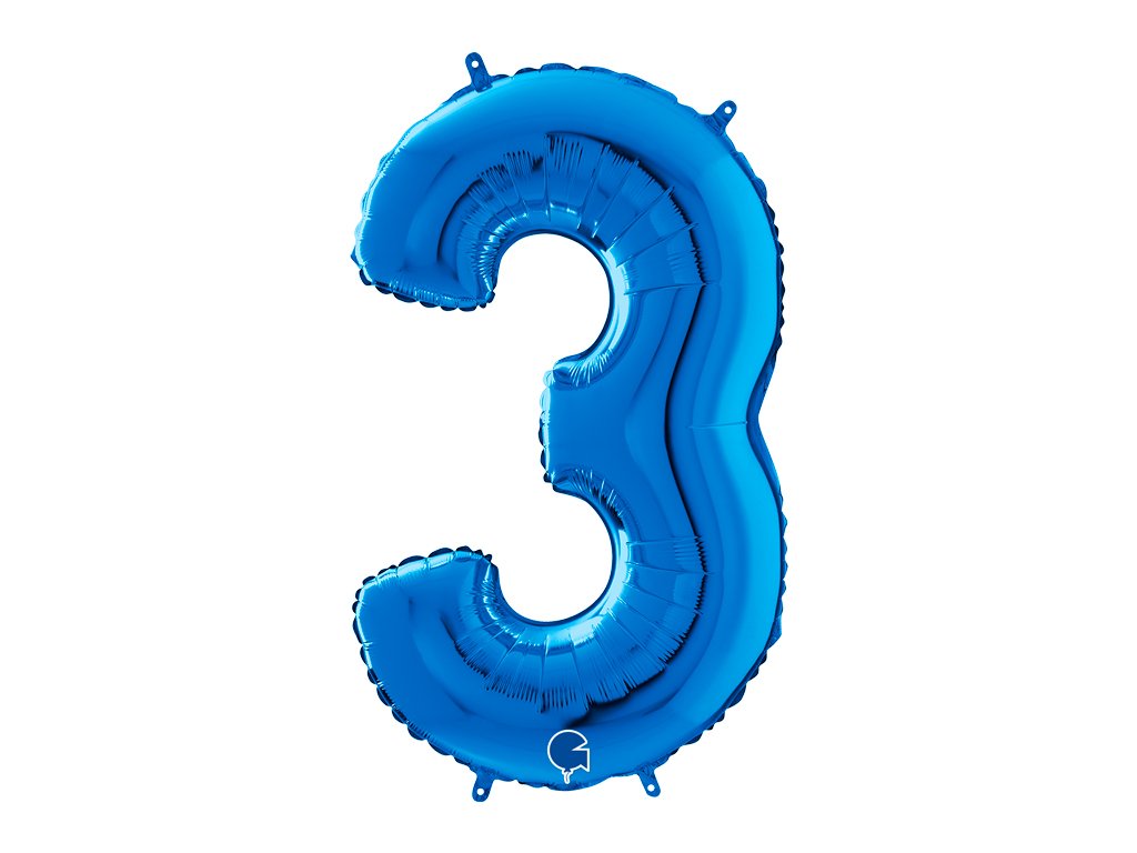 Balón fóliový 66 cm, v modré barvě. Číslice 3. Vhodný k naplnění héliem i vzduchem.
